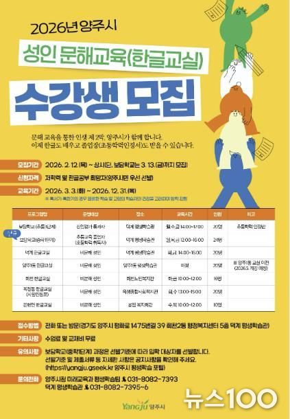 뉴스100 김동초 기자 | 양주시가 오는 3월 13일까지 학력인정 문해교육인 ▲ 보담학교 초등 3단계(졸업과정)와 ▲ 보담학교 중학 1단계 과정의 수강생을 모집한다.