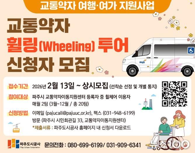 뉴스100 김동초 기자 | 파주시 교통약자이동지원센터는 교통약자의 이동권 확대와 여가 활동 증진을 위해 '교통약자 휠링(Wheeling) 투어 지원사업'을 3월부터 본격 운영한다고 밝혔다.