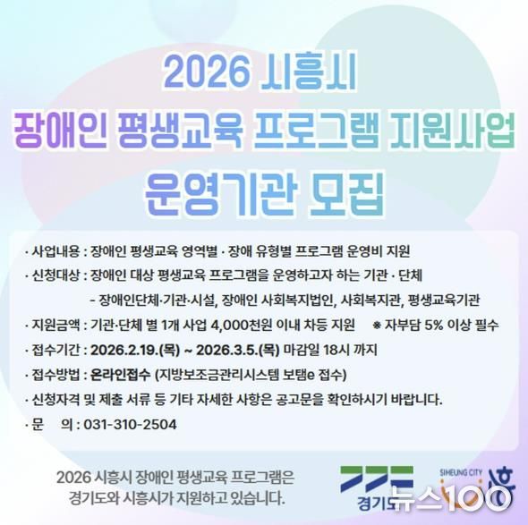 뉴스100 김동초 기자 | 시흥시는 장애인의 학습권을 보장하고 사회참여 기회를 확대하기 위해 ‘2026년 장애인 평생교육 프로그램 지원사업’을 추진하는 가운데 운영기관을 모집한다.