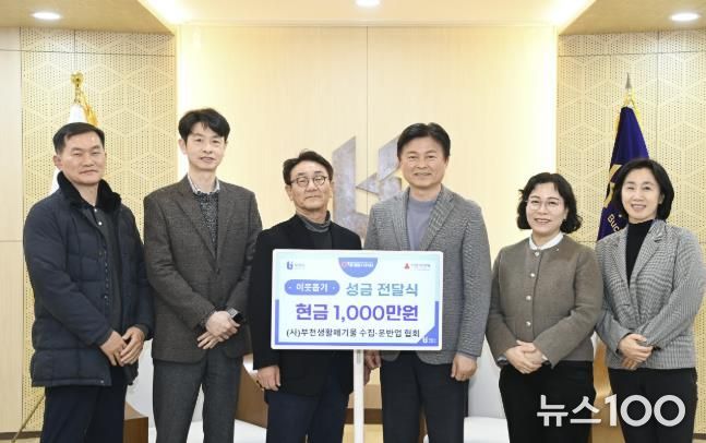 뉴스100 김동초 기자 | 부천시는 최근 (사)부천생활폐기물수집·운반업협회로부터 성금 1,000만 원을 기탁받았다고 19일 밝혔다. 전달식에는 염기동 이사장을 비롯해 김경관 감사, 설관종 사무국장 등 협회 관계자 3명이 참석했다.