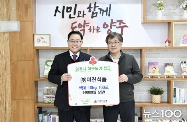 뉴스100 김동초 기자 | 양주시는 최근 ㈜미진식품로부터 이웃돕기 성품으로 백미 10kg 100포(400만 원 상당)를 기탁받았다고 밝혔다.