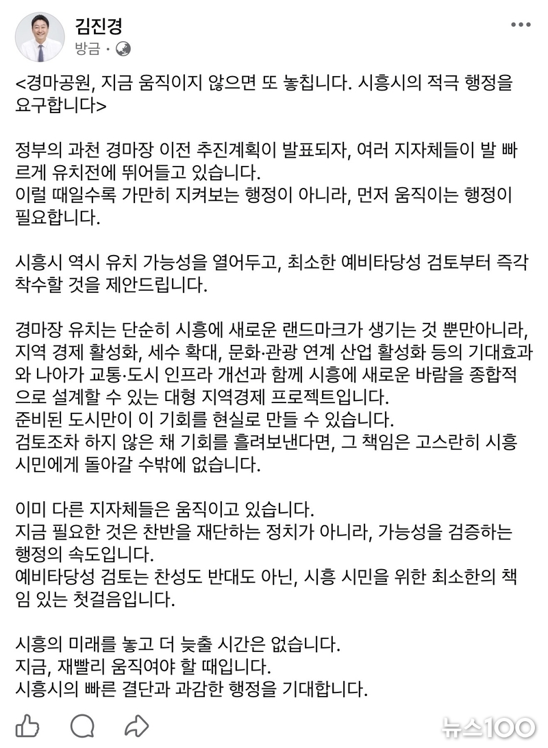 김 의장은 이날 페이스북 등 자신의 SNS를 통해 “경마공원, 지금 움직이지 않으면 놓친다”며 즉각적인 예비타당성 검토 착수 등 경마장 유치에 필요한 시흥시의 속도감 있는 움직임이 필요하다고 밝혔다.