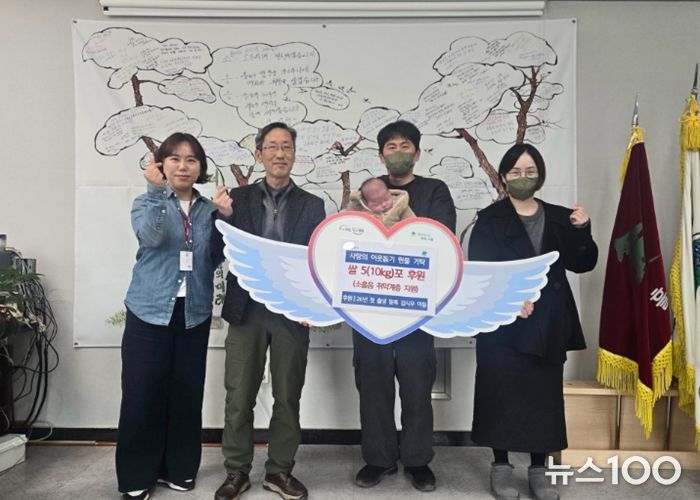 뉴스100 김동초 기자 | 포천시 소흘읍 행정복지센터는 지난 24일 2026년 소흘읍 첫 출생신고 주인공인 김시우 군의 가정이 지역 내 취약계층을 위해 쌀 50kg를 기탁했다고 밝혔다.