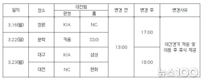 뉴스100 김동초 기자 | 2026 KBO 시범경기 중 일부 경기의 개시 시간이 야간경기 적응 및 이동 후 휴식 제공을 위해 변경됐다.