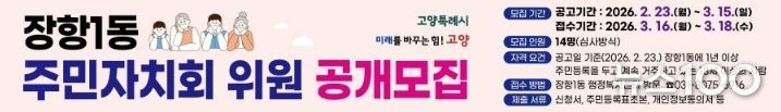 뉴스100 김동초 기자 | 고양특례시 일산동구 장항1동이 2026년 상반기 주민자치회 위원을 공개 모집한다.