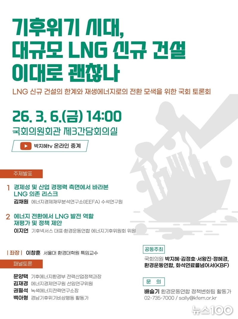 3월 6일 국회에서는 더불어민주당ㆍ조국혁신당ㆍ진보당 국회의원과 환경운동연합 등의 공동주최로 ‘대규모 LNG 신규 건설, 이대로 괜찮나’라는 주제의 토론회가 열립니다.