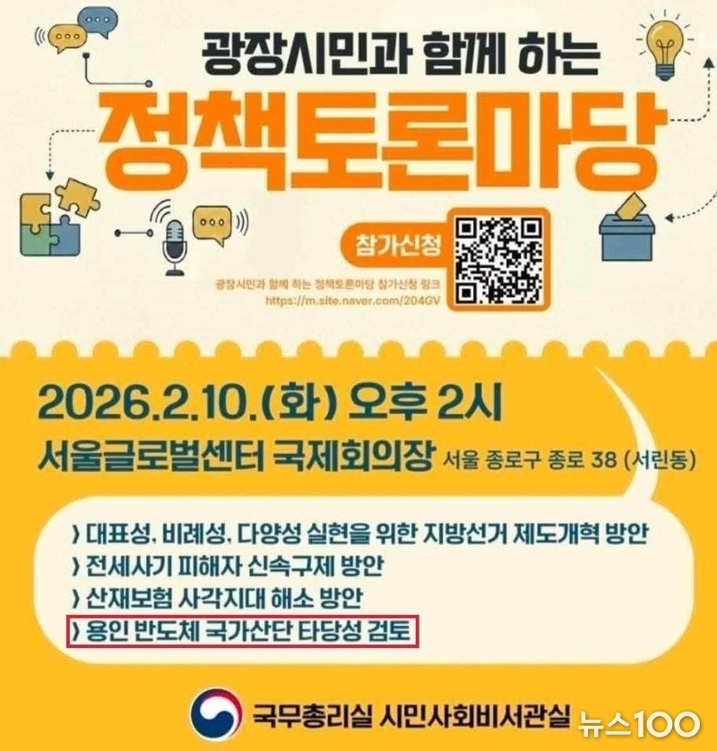 이에 용인시민들이 "용인 반도체 국가산단은 2024년 12월 산단 계획에 대한 정부 승인을 받았고, 올해 1월엔 서울행정법원이 정부의 승인 과정에 법적 하자가 없다며 일부 환경단체가 낸 소송을 각하했는데, '광장시민'이 무슨 권한으로 타당성 검토를 한다는 말이냐"고 항의하자 총리실 시민사회비서관실과 사회대개혁위원회는 토론 당일 해당 주제를 의제에서 뺐습니다.