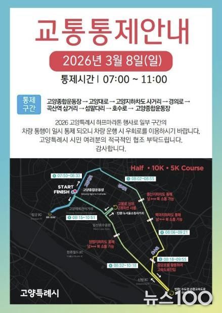 뉴스100 김동초 기자 | 고양특례시는 오는 8일‘2026 고양특례시 하프 마라톤 대회’ 개최 로 고양시 주요 도로에서 교통 통제가 이루어짐에 따라 시민들의 적극적인 협조를 당부한다고 밝혔다.