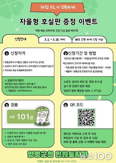 또한, 군민 참여 확대를 위해 ‘자율형 호실판 증정 이벤트’도 병행 추진한다. 이벤트는 3월 3일부터 3월 20일까지 온라인 설문 방식으로 진행되며, 상세주소 부여가 필요한 양평군민을 대상으로 선착순 50명에게 지자체 캐릭터를 활용한 자율형 호실판 에코백이 제공될 예정이다.