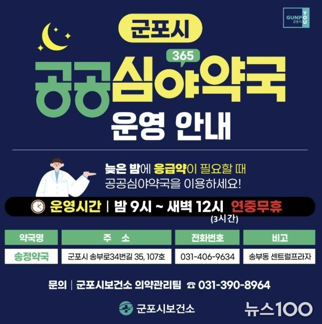 뉴스100 김동초 기자 | 군포시가 오는 3월부터 심야 시간 시민들의 의약품 구매 불편을 해소하고 안전한 투약 환경을 조성하기 위해 연중무휴 ‘공공심야약국’을 신규 지정·운영한다고 밝혔다.