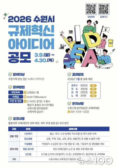 뉴스100 김동초 기자 | 수원특례시가 9일부터 4월 30일까지 ‘2026 규제혁신 아이디어’를 공모한다.