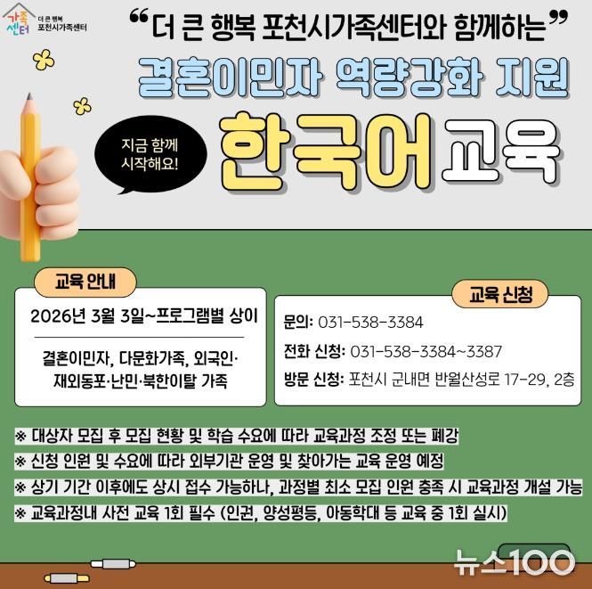 뉴스100 김동초 기자 | 포천시 더 큰 행복 포천시가족센터는 2026년 결혼이민자 역량강화 지원 사업의 일환으로 한국어교육 과정을 수준별, 단계별 체계로 확대 개편하고 본격적인 운영에 들어갔다.
