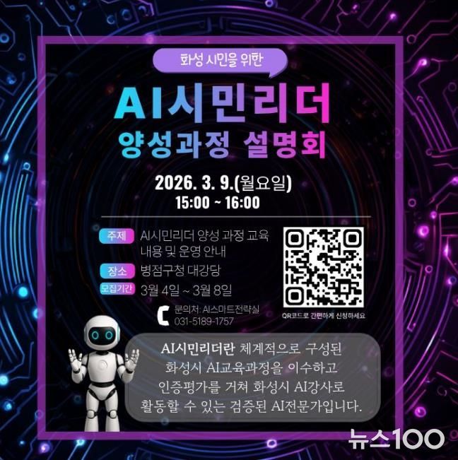 뉴스100 김동초 기자 | 화성특례시는 시민이 학습하고 교육하는 인공지능(AI) 학습 체계 구축을 위해 ‘2026년 AI시민리더 양성 교육’ 설명회를 3월 9일 오후 3시에 병점구청 대강당에서 개최한다.