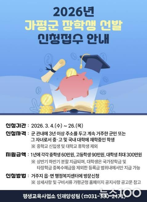 뉴스100 김동초 기자 | 가평군이 지역 학생들의 균등한 교육 기회를 보장하고 우수 인재를 육성하기 위해 2026년도 장학생 선발에 나선다.