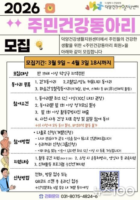 뉴스100 김동초 기자 | 고양특례시 덕양건강생활지원센터가 지역주민이 주도하는 건강 행복 도시조성을 위해 ‘주민건강동아리’참여자를 모집한다.