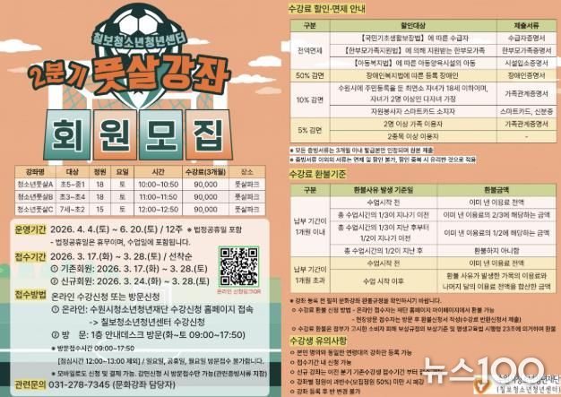 뉴스100 김동초 기자 | 수원시청소년청년재단 칠보청소년청년센터는 지역 청소년들의 건강한 여가 생활과 체력 증진을 위해녪년 2분기 문화강좌(풋살 교실)’수강생을 모집한다고 밝혔다.