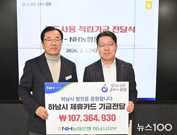 뉴스100 김동초 기자 | NH농협은행 하남시지부가 5일 제휴카드 사용 적립기금 107,364,930원 하남시에 전달했다고 밝혔다.
