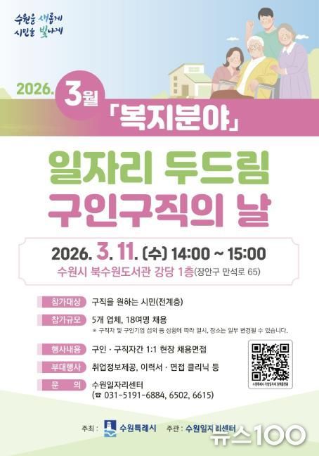 뉴스100 김동초 기자 | 수원특례시는 3월 11일 오후 2시부터 3시까지 북수원도서관 강당에서 ‘3월 일자리 두드림 구인·구직의 날’을 개최한다.