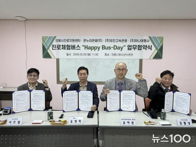뉴스100 김동초 기자 | 의왕시청소년재단 산하 의왕시진로지원센터 ‘꿈터’가 청소년들의 진로 탐색을 지원하기 위해 3월 9일 관내 운수업체와 ‘진로체험버스’ 운영을 위한 업무협약(MOU)을 체결했다.