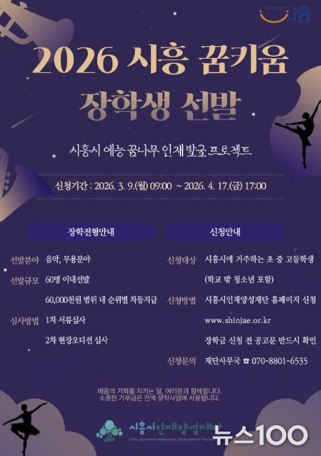 뉴스100 김동초 기자 | 시흥시인재양성재단은 지역 내 예능 분야 인재를 발굴ㆍ육성하기 위해 ‘2026년 시흥 꿈키움 장학생’을 60명 이내로 선발한다.