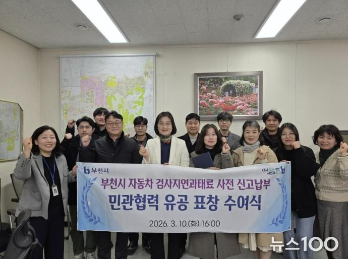 뉴스100 김동초 기자 | 부천시는 지난 10일 시(市) 차량등록과 사무실에서 ‘자동차 검사지연 과태료 사전신고 납부’ 활성화에 기여한 유공자 9명에게 표창을 수여했다.