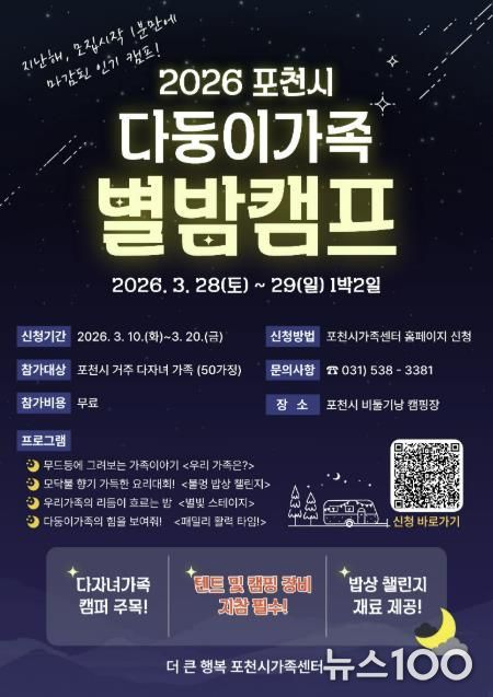 뉴스100 김동초 기자 | 포천시 더 큰 행복 포천시가족센터는 다자녀 가족의 가족 친화 문화 참여 기회를 확대하고 가족 간 교류 활성화를 지원하기 위해 ‘2026 포천시 다둥이가족 별밤 캠프’ 참여 가족을 모집한다.