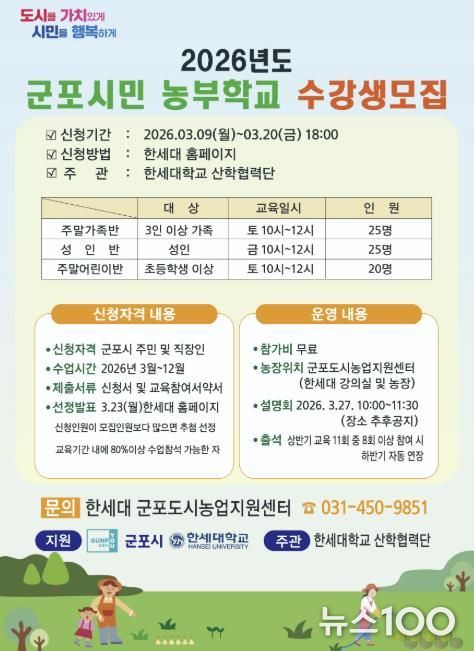 뉴스100 김동초 기자 | 군포시 도시농업 활성화 지원사업 보조사업자인 한세대학교가 오는 3월 20일까지 2026년도 군포시민 농부학교 신규 수강생을 모집한다고 밝혔다.