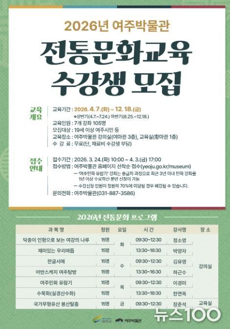 뉴스100 김동초 기자 | 여주시 여주박물관은 오는 3월 24일부터 ‘2026년 전통문화교육’ 수강생을 모집한다.