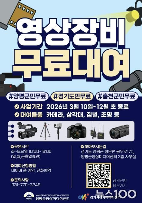 뉴스100 김동초 기자 | 양평군은 2026년 ‘시청자미디어재단 경기센터 장비 지원 사업’ 공모에 2024년과 2025년에 이어 3년 연속 선정돼 올해 12월까지 미디어 장비 대여 서비스를 운영한다고 밝혔다.