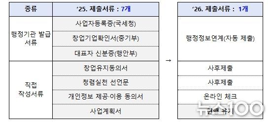 행정정보 연결로 사업자등록증, 재무제표 등 행정서류는 자동수집한다. 개인정보제공동의서 등은 온라인 체크로 대체한다. 또한, 기업 심사에 불필요한 서류는 폐지하거나 선정된 기업만 제출한다. 사업계획서 제한 분량도 평균 14장에서 9.4장까지 30% 이상 감축할 계획이다.