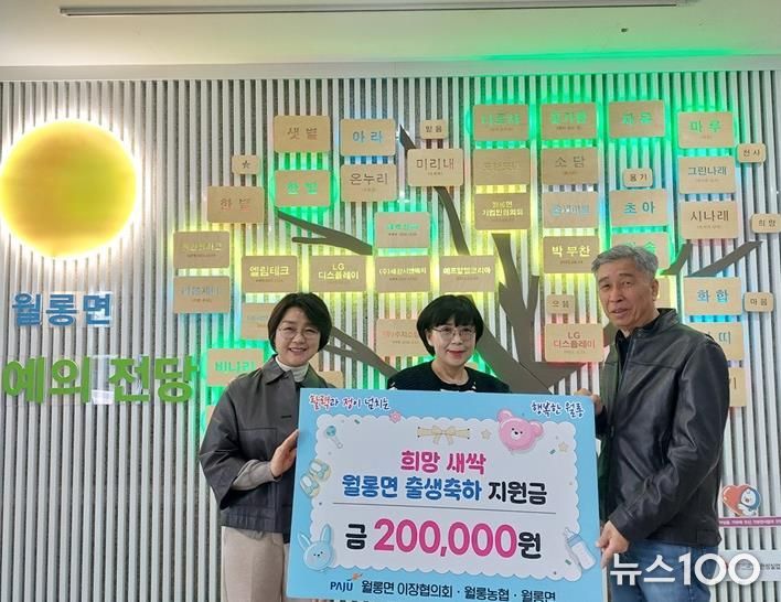 뉴스100 김동초 기자 | 파주시 월롱면 이장협의회는 지난 17일 2025년 4분기 중 월롱면에서 태어난 출생아 가정에 1인당 20만 원의 ‘월롱 하나로마트 상품권’을 전달했다.