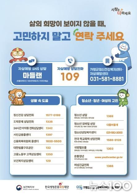 뉴스100 김동초 기자 | 가평군정신건강복지센터와 자살예방센터가 봄철 자살 위험 증가에 대응해 집중 예방 활동에 나섰다.