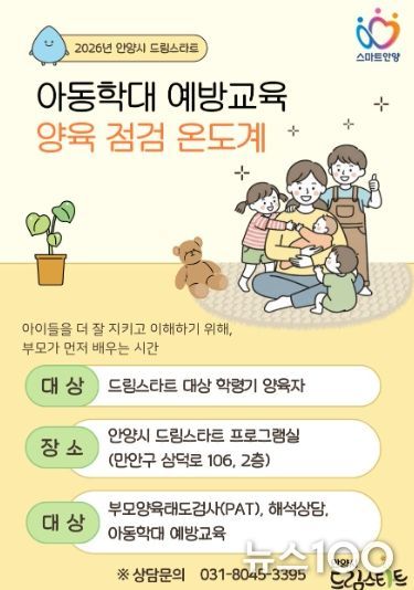 뉴스100 김동초 기자 | 안양시가 아동 학대를 사전에 차단하고 건강한 양육 환경을 조성하기 위해 맞춤형 부모 교육 프로그램인 ‘2026 드림스타트 양육 점검 온도계’를 본격 가동한다고 18일 밝혔다.
