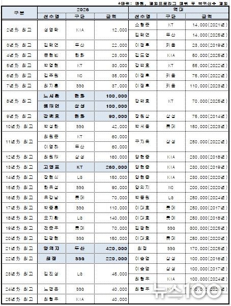 또한 2026시즌부터 시행되는 아시아쿼터 선수들의 연봉도 집계됐다. LG 웰스, SSG 타케다, 두산 타무라가 각각 20만 달러씩 받으며 아시아쿼터 선수 연봉(계약금 포함) 공동 1위에 올랐다.