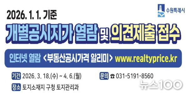 뉴스100 김동초 기자 | 수원시 영통구는 3월 18일부터 4월 8일까지 20일간 2026년 1월 1일 기준 개별공시지가에 대한 열람을 실시하고 토지소유자 및 이해관계인의 의견을 접수한다.
