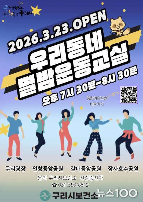 뉴스100 김동초 기자 | 구리시는 3월 23일부터 10월 30일까지 지역 주민의 건강증진과 규칙적인 신체활동 실천을 돕기 위해 구리광장, 인창중앙공원, 갈매중앙공원, 장자호수공원 등 4개소에서 ‘우리동네 별밤운동교실’을 운영한다고 밝혔다.