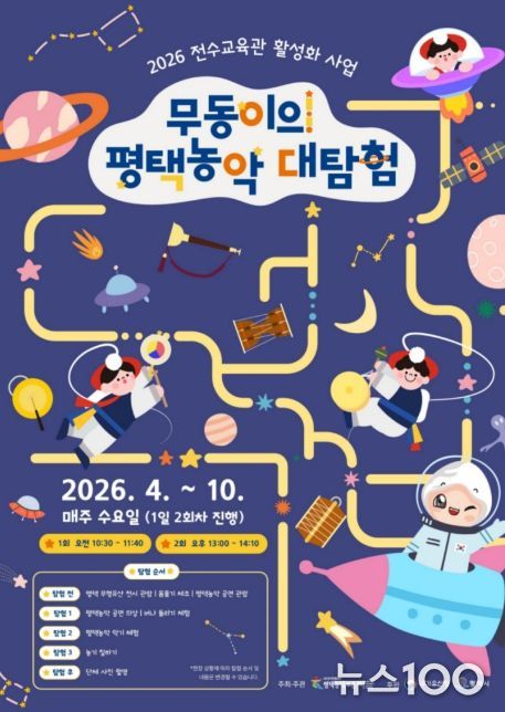 뉴스100 김동초 기자 | 평택시는 오는 4월 29일부터 10월 28일까지 2026년 전수교육관 활성화 지원사업 ‘무동이의 평택농악 대탐험’을 평택무형유산 전수교육관에서 매주 수요일, 1일 2회차 총 38회를 운영한다고 밝혔다.