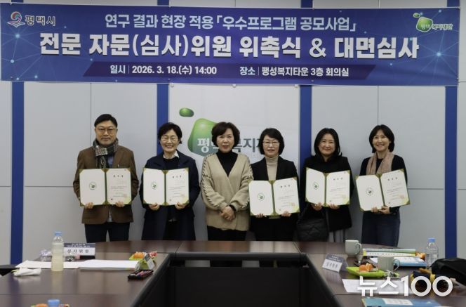 뉴스100 김동초 기자 | 평택복지재단은 2026년 3월 18일, 팽성복지타운에서 관내 사회복지 서비스의 질적 도약과 지역복지 강화를 위한녪년 연구 결과 현장 적용 우수프로그램 공모사업’심사위원 위촉식 및 대면 심사를 진행했다.