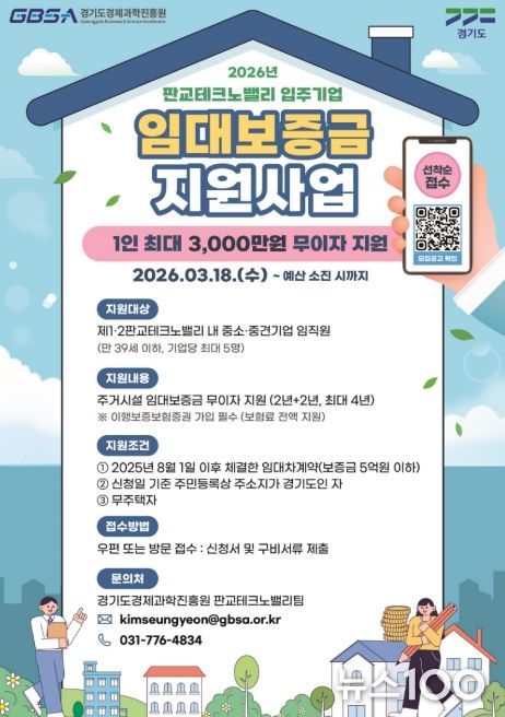 뉴스100 김동초 기자 | 경기도와 경기도경제과학진흥원이 판교테크노밸리 청년 임직원의 주거비 부담 완화를 위해 임대보증금 최대 3천만 원을 무이자로 지원한다.
