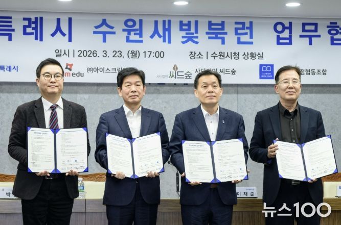 수원시와 ㈜아이스크림에듀, (사)씨드(Seed)숲, 수원시서점협동조합은 23일 시청 상황실에서 ‘수원새빛북런(Book Learn) 업무협약’을 체결하고, 협력을 약속했다.