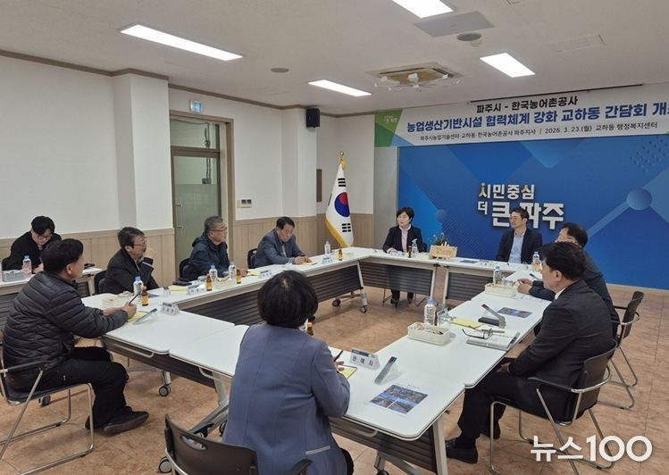 뉴스100 김동초 기자 | 파주시농업기술센터는 지난 23일 교하동 행정복지센터에서 한국농어촌공사 파주지사와 함께 농업생산기반시설의 효율적 관리를 위한 협력 방안을 논의하는 간담회를 개최했다.