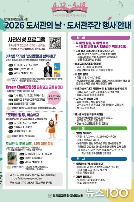 뉴스100 김동초 기자 | 경기도교육청성남도서관이 2026년 도서관의 날(4월 12일)과 도서관 주간(4월 12일~18일)을 맞아 다양한 독서·문화행사를 운영한다.