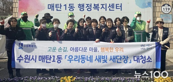 뉴스100 김동초 기자 | 영통구 매탄1동 행정복지센터는 지난 24일, '우리동네 새빛 새단장' 사업의 일환으로, 새봄맞이 대청소 및 초화 식재 활동을 실시했다.