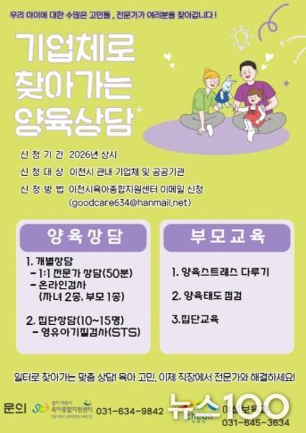 뉴스100 김동초 기자 | 이천시는 맞벌이나 교대근무 등 열악한 근무 여건으로 인해 양육 정보 접근에 어려움을 겪는 부모들을 위해 ‘기업체로 찾아가는 양육상담 서비스’를 본격 운영하다고 밝혔다.