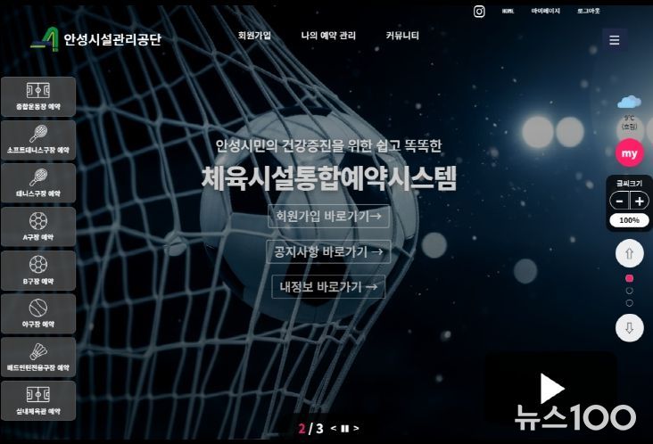 뉴스100 김동초 기자 | 안성시시설관리공단은 안성시민우선예약 도입을 위해 체육시설 통합 사이트를 신규 구축하여 20일부터 오픈했다고 밝혔다.