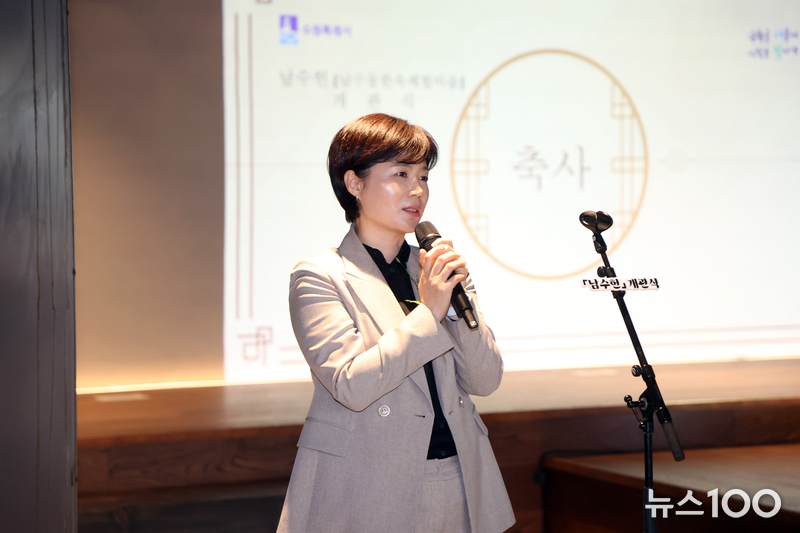 <사진설명2: 장미영 수원특례시의회 문화체육교육위원장이 27일 ‘남수헌’ 개관식에서 축사를 하고 있다.>