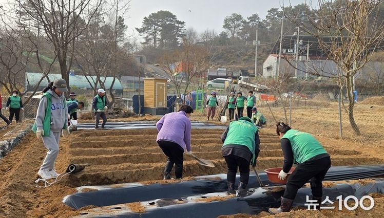 뉴스100 김동초 기자 | 파주시 탄현면 새마을회 남·녀지도자는 지난 26일 축현2리 소재 감자밭에서 이웃 돕기 성금 마련을 위한 사랑의 감자심기 행사를 진행했다.
