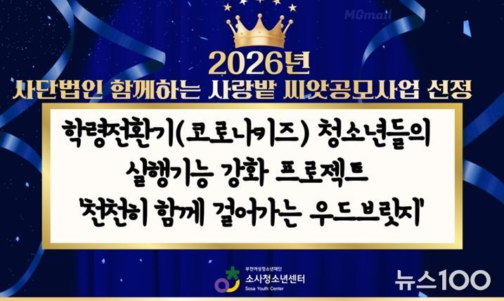 뉴스100 김동초 기자 | 부천여성청소년재단이 운영하는 소사청소년센터가 사단법인 함께하는 사랑밭 주관 ‘2026년 함께하는 사랑밭 [씨앗공모사업]’ 기획공모 분야에 ‘학령전환기(코로나키즈) 청소년들의 실행기능 강화 프로젝트-천천히 함께 걸어가는 우드브릿지’ 프로그램이 선정됐다.