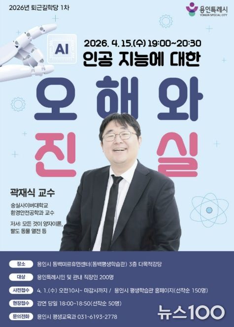 뉴스100 김동초 기자 | 용인특례시는 4월 15일 오후 7시부터 동백미르휴먼센터 3층 동백평생학습관 다목적 강당에서 ‘2026년 퇴근길 학당’ 첫 번째 강연을 한다고 31일 밝혔다.