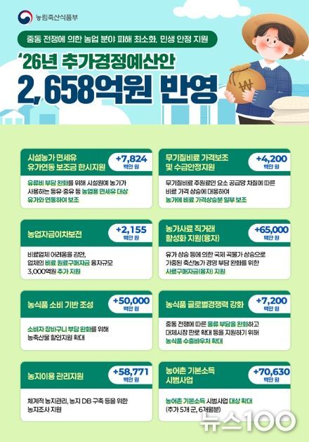 뉴스100 김동초 기자 | 농림축산식품부는 2026년 추가경정예산안으로 총 2,658억원을 편성했다고 밝혔다.